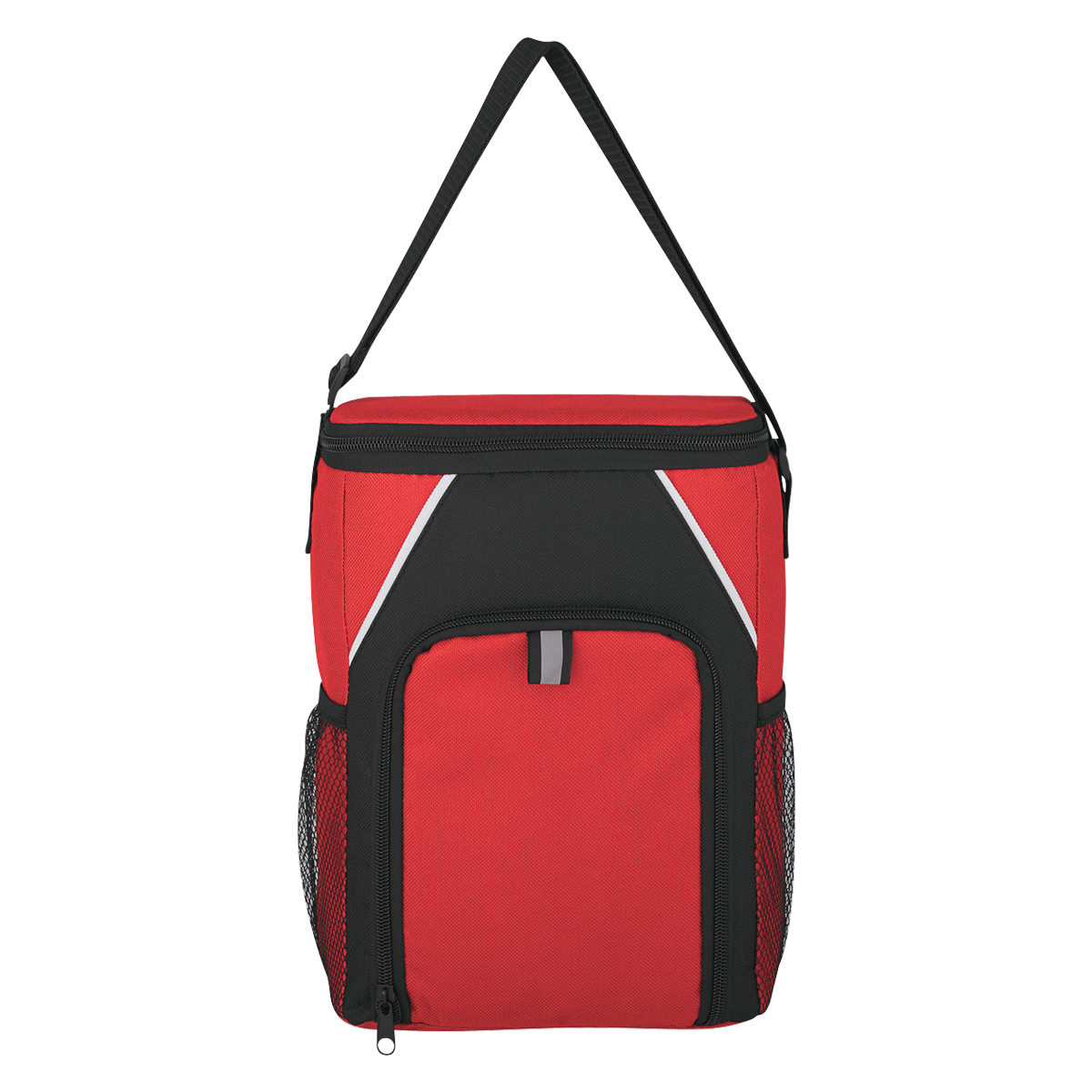 Hielera fabricada de poliéster 600D con revestimiento PEVA. Cuenta con correa de hombro ajustable, presilla para colocar un bolígrafo o llaves, 2 bolsillos laterales de malla, bolsillo frontal con cierre y un compartimiento principal con cierre.